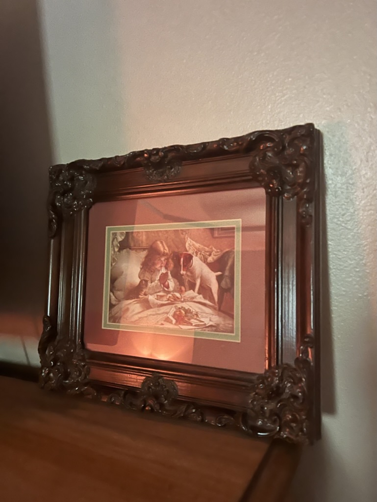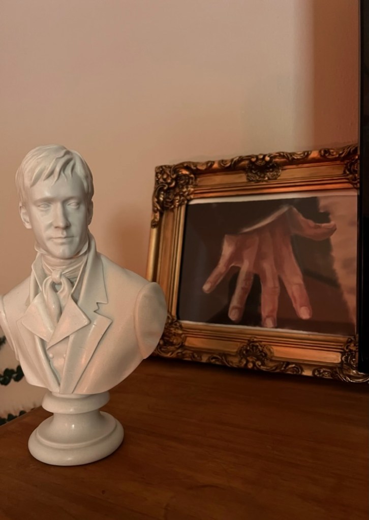 If you noticed, I had an iconic movie on while doing this project. So it was only right that I put one of my most prized possessions, a print of The Hand Flex (I got it from this seller on Etsy) in this frame, next to one of my other most prized possessions (a marble bust of Mr. Darcy, also from Etsy).