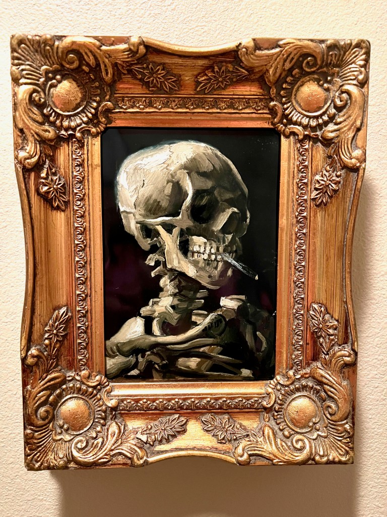 I had the idea to turn it into some art for Halloween. I went over to Etsy and bought this digital file of Van Gogh’s Skull of a Skeleton with Burning Cigarette: https://www.etsy.com/listing/1270872166/van-gogh-print-skull-of-a-skeleton-with?ref=yr_purchases and then got the file printed at my local Walgreens for $3.23.